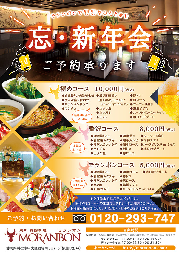 年末年始の忘年会・新年会にオススメのコースをご用意してお待ちしております。大切な方たちとの心に残る特別なひとときを、ぜひモランボンでお過ごしください。